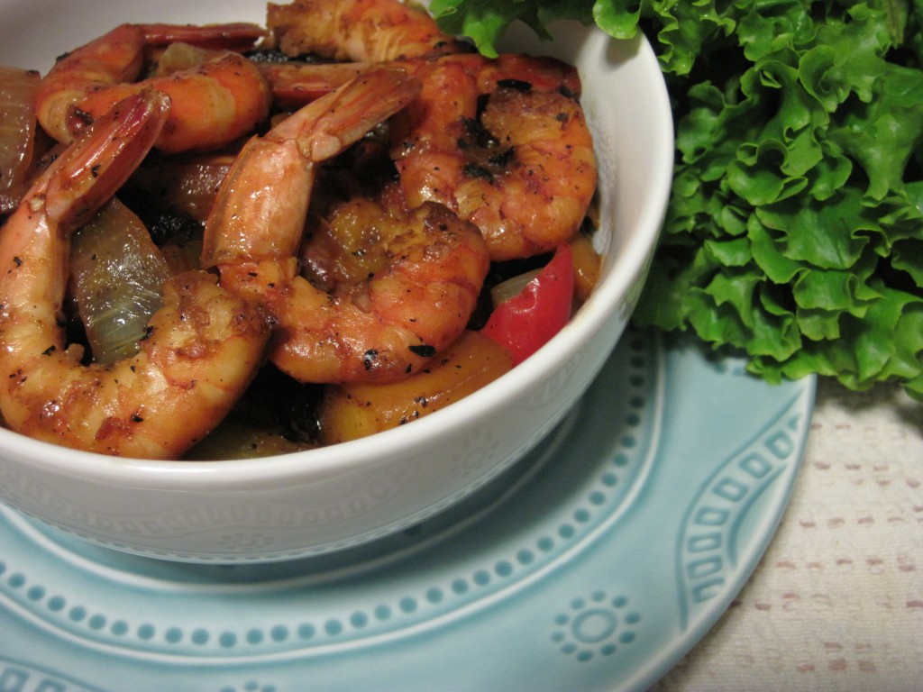 - When oil is hot, add bell peppers, onion, mango, and shrimp to the skillet.